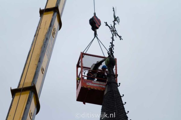 Op 1 april is het torenkruis weer teruggeplaatst. Bij de voorjaarsstorm van vorig jaar was het beschadigd en stond het scheef.Het is toen van de toren afgehaald om gerestaureerd te worden. Dat was hoognodig, bleek nadat het veilig naar beneden is gebracht. We hebben geprobeerd om het voor kerstmis nog terug te plaatsen, maar de weersomstandigheden verhinderden dat. Het moet wel een beetje goed weer zijn voor de werkmensen om veilig, hangend in een bakje aan de kraan, het kruis terug te plaatsen en goed vast te zetten. Ook deze keer hebben we de eerste poging moeten afbreken, het waaide te hard, maar nu is het toch nog goed gekomen. Nu is het gelukt en kan het haantje weer trots uitkijken over Wijk bij Duurstede.Diaken van der Helm hield samen met de omstanders een korte plechtigheid en zegende het kruis en haan rijkelijk.