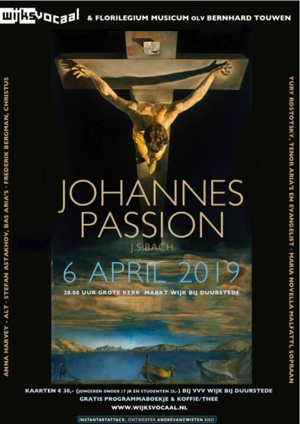 Uitvoering: Grote Kerk, zaterdag 6 april, Wijks Vocaal en barokorkest Florilegium Musicum olv Bernhard Touwen, solisten: Yury Rostotski, tenor-aria’s en evangelist; Maria Novella Malfatti, sopraan; Anna Harvey, alt; Stefan Astakhov, bas-aria’s en Frederik Bergman, Christus.Kaarten 30 € (jongeren onder 17 en studenten: 25 €) verkrijgbaar bij de VVV Wijk bij Duurstede en via de website WWW.WIJKSVOCAAL.NL