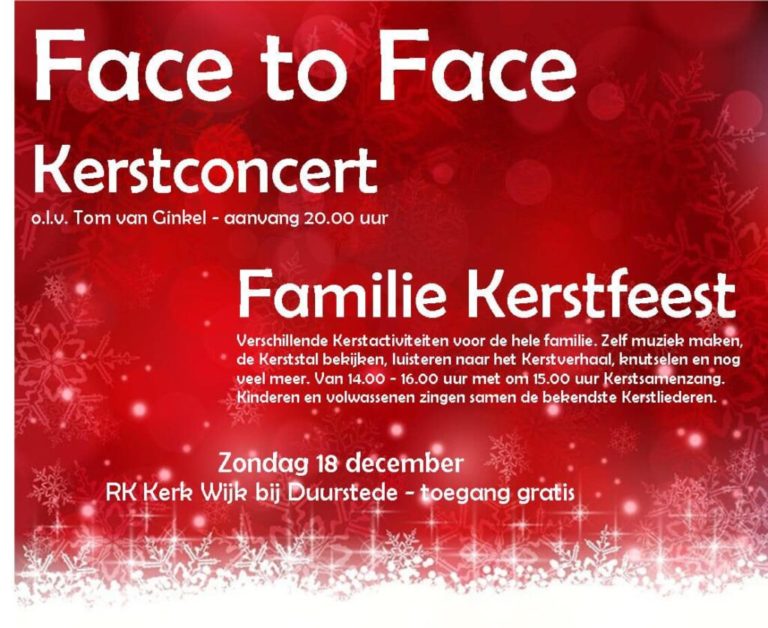Zondag 18 december om 20.00 uur is het jaarlijkse kerstconcert van het Face to Face koor olv Tom van Ginkel. Er zal een zeer gevarieerd programma worden gepresenteerd met nieuwe kerstliederen afgewisseld met bekende melodieën, van pop tot klassiek, van…