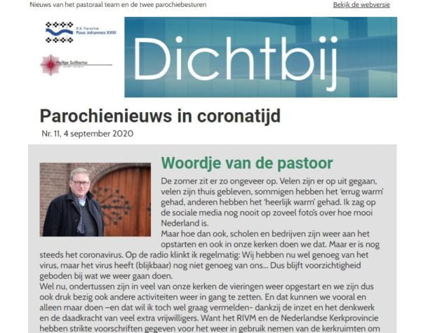In deze tijden verschijnt er regelmatig een nieuwsbrief van de parochie: Dichtbij. U kunt zich op deze nieuwsbrief abonneren via het inschrijfformulier. U krijgt het dan automatisch in uw mailbox. De laatste versie: Dichtbij