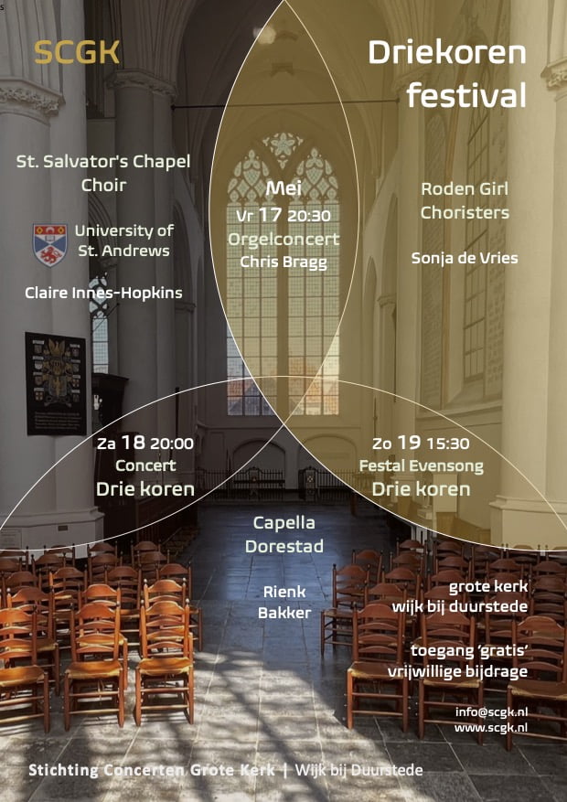 In de viering doen, naast het St. Salvator’s Chapel Choir uit het Schotse St. Andrews, de Roden Girl Choristers en Capella Dorestad mee. Deze oecumenische Evensong vormt de afsluiting van het Driekorenfestival in Wijk bij Duurstede.