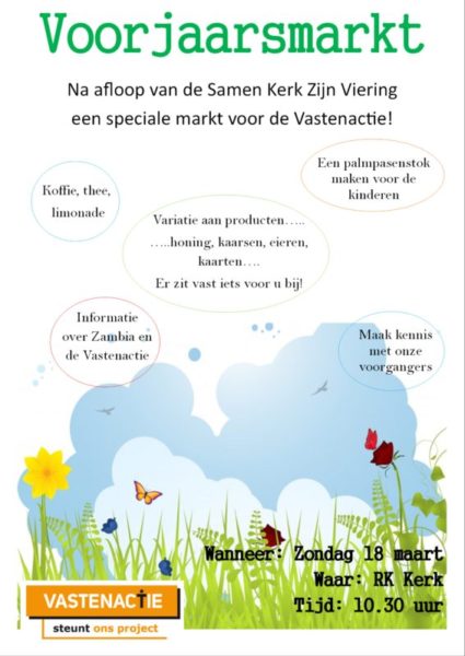 Zondag is het namelijk de vijfde zondag van de Veertigdagentijd. De Vastenactie zal dan ook een belangrijke rol spelen deze viering. Ook jij kan je steentje daaraan bijdragen. Na afloop zal er namelijk een Voorjaarsmarkt plaatsvinden.